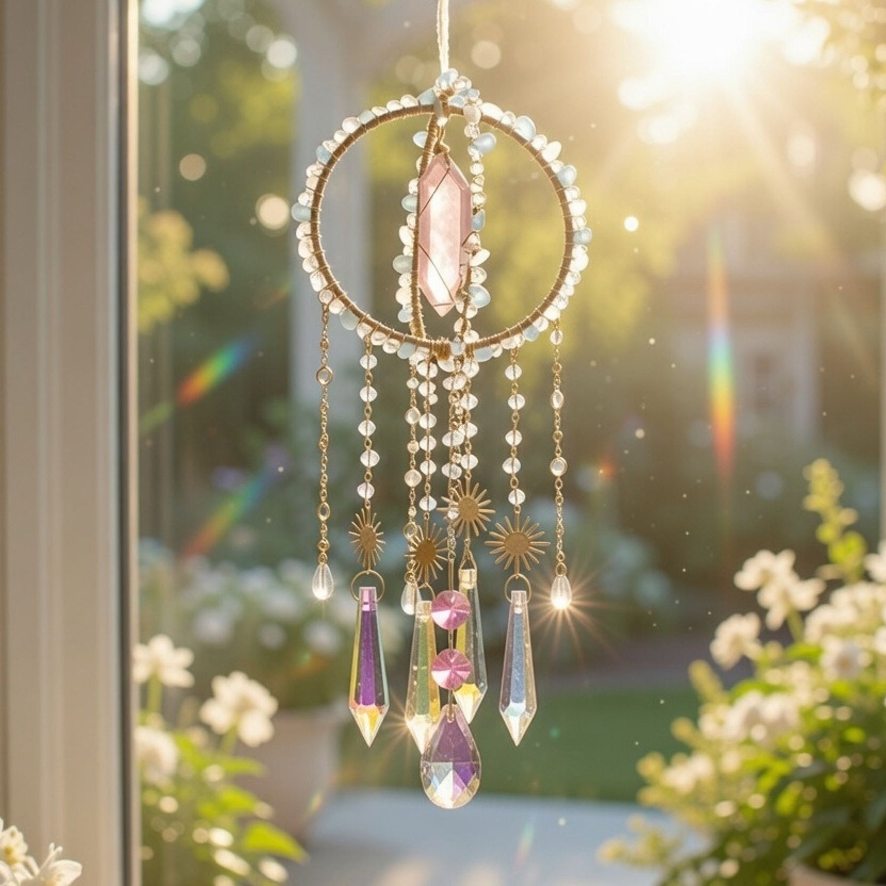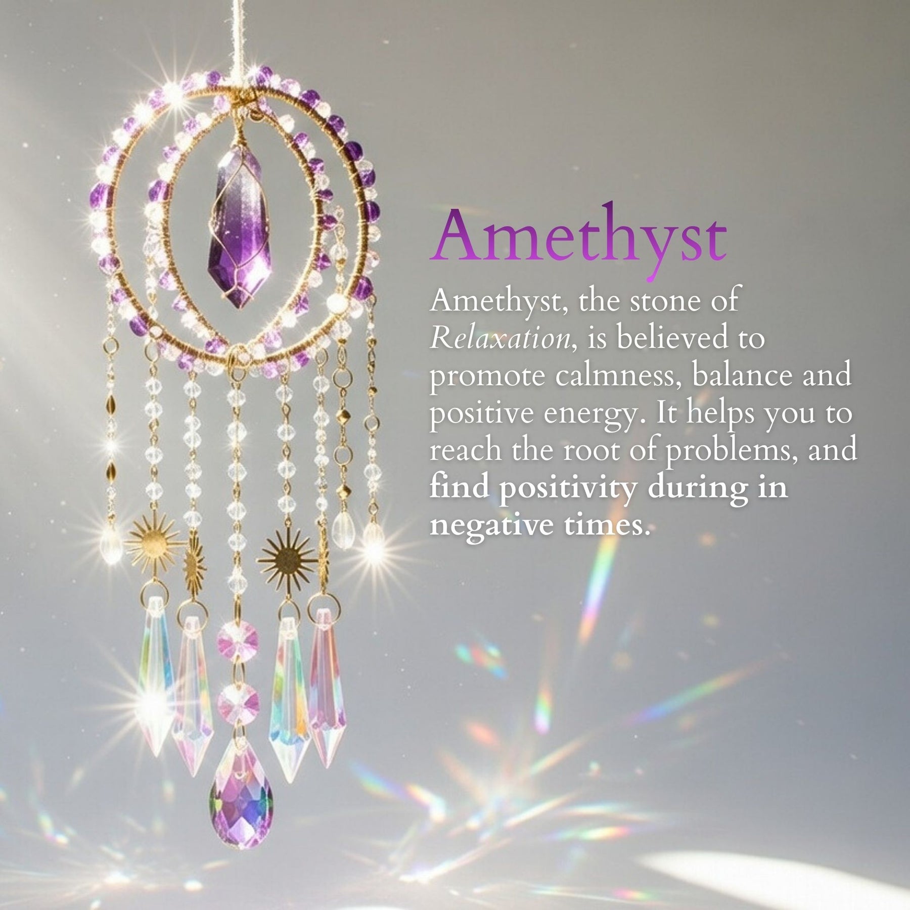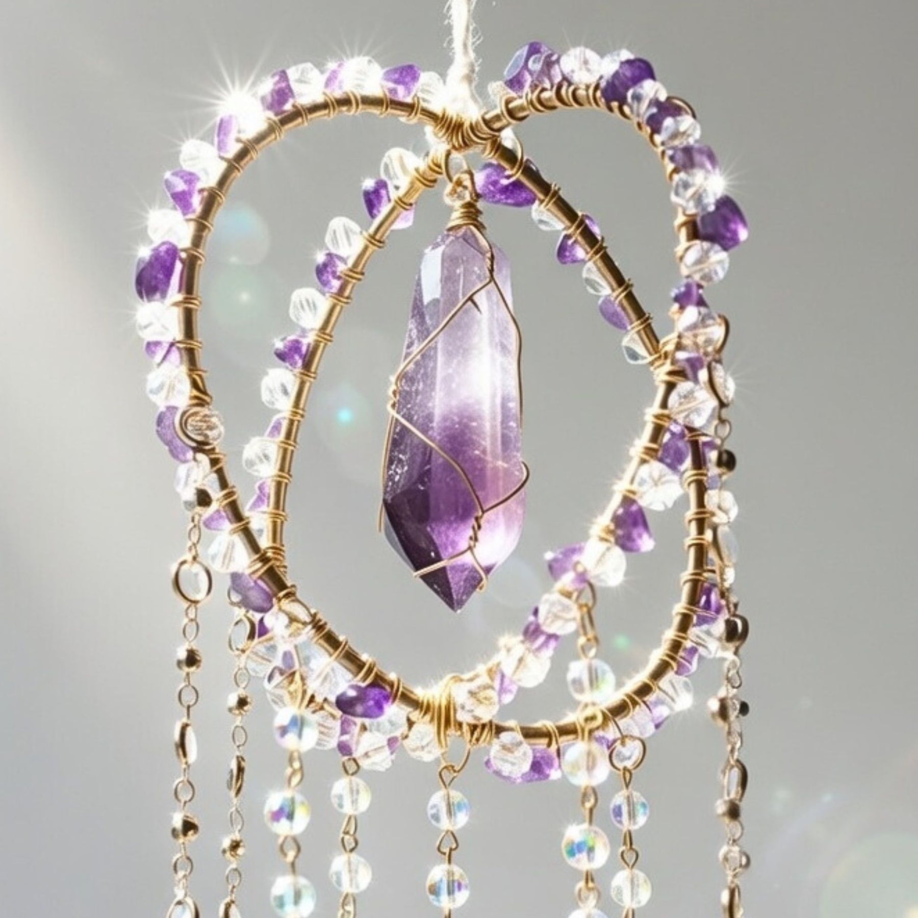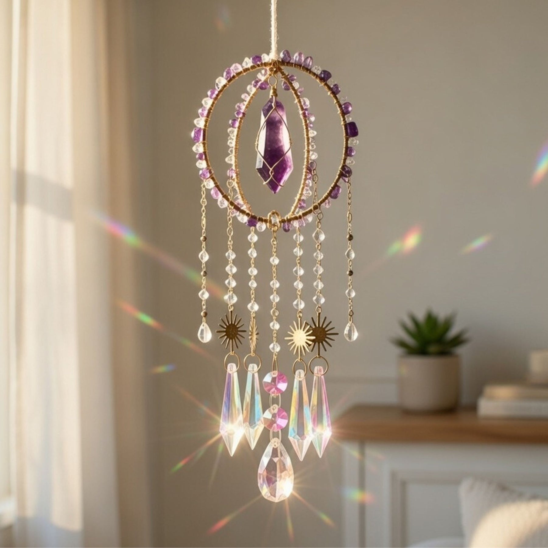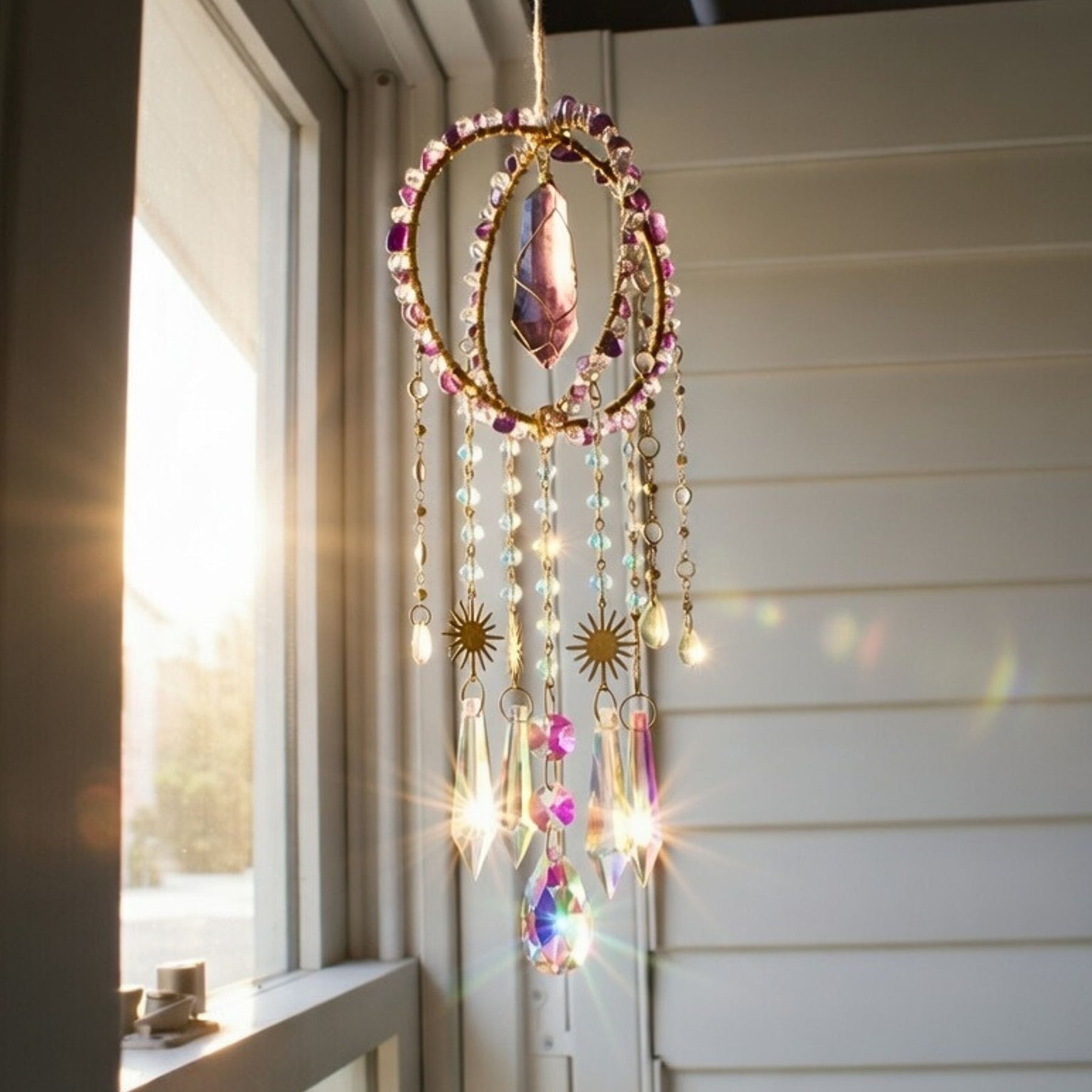 Hang your Divinity Suncatcher by any window to turn your room into a sparkling oasis of sunlit sparkles. Enhance your spiritual being as you charge your crystals in the sunlight and moonlight.
