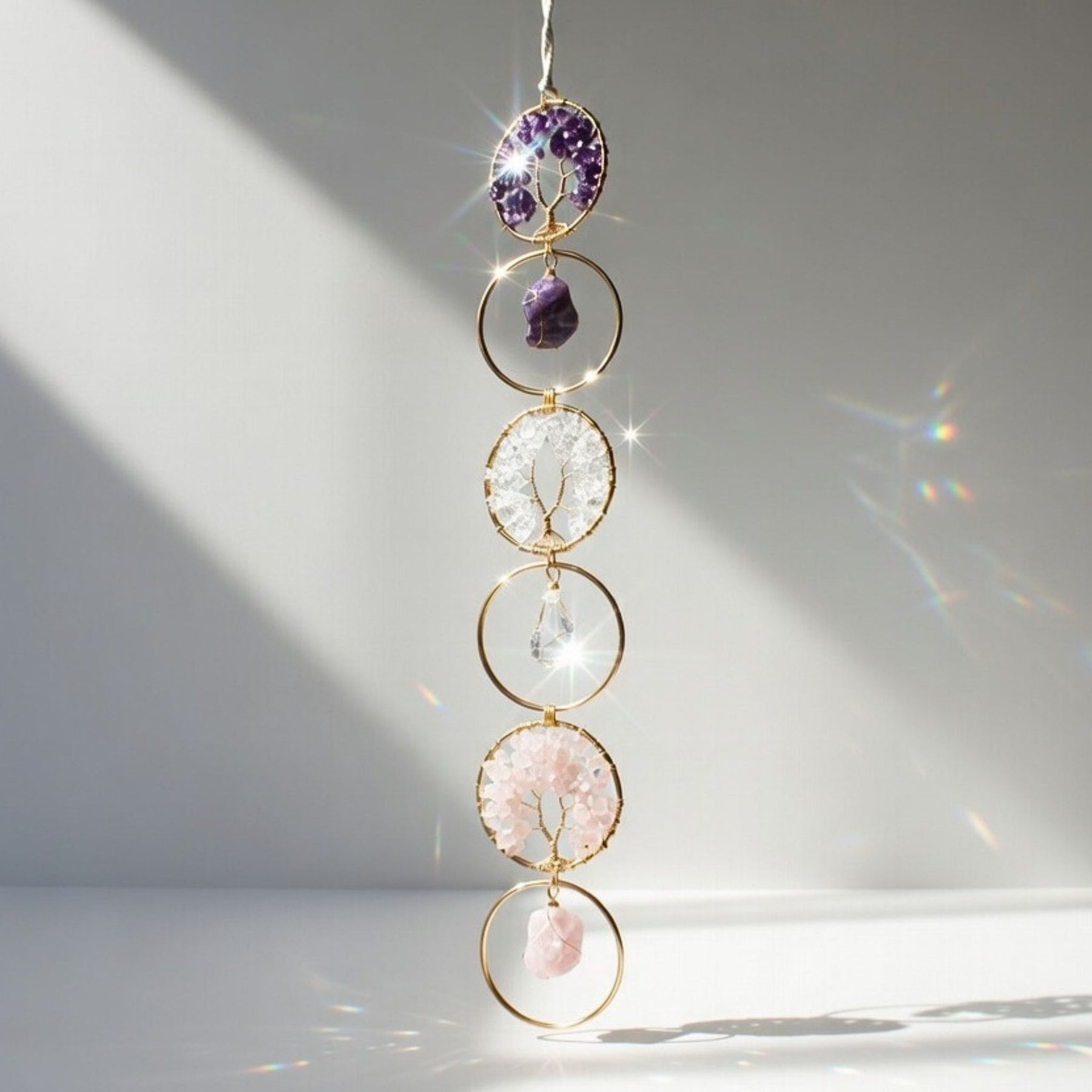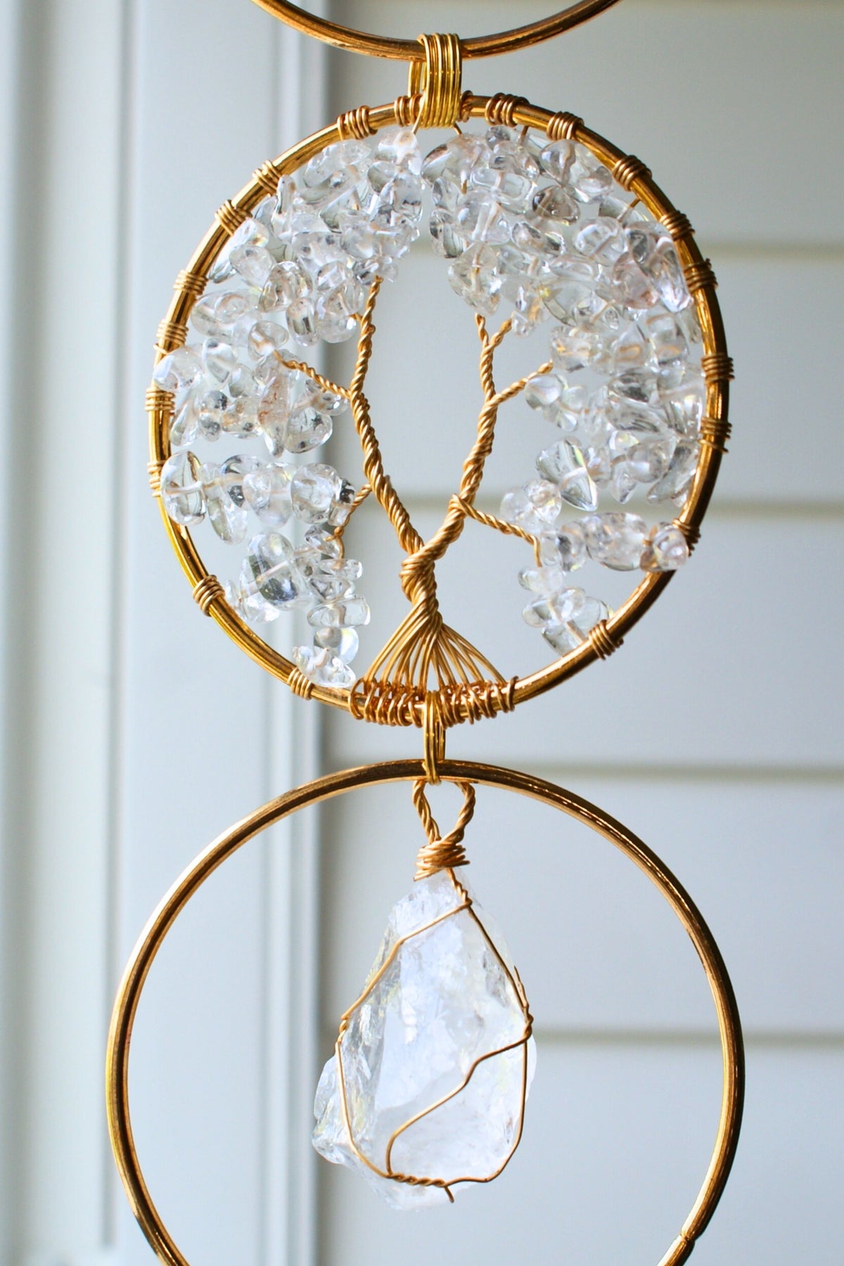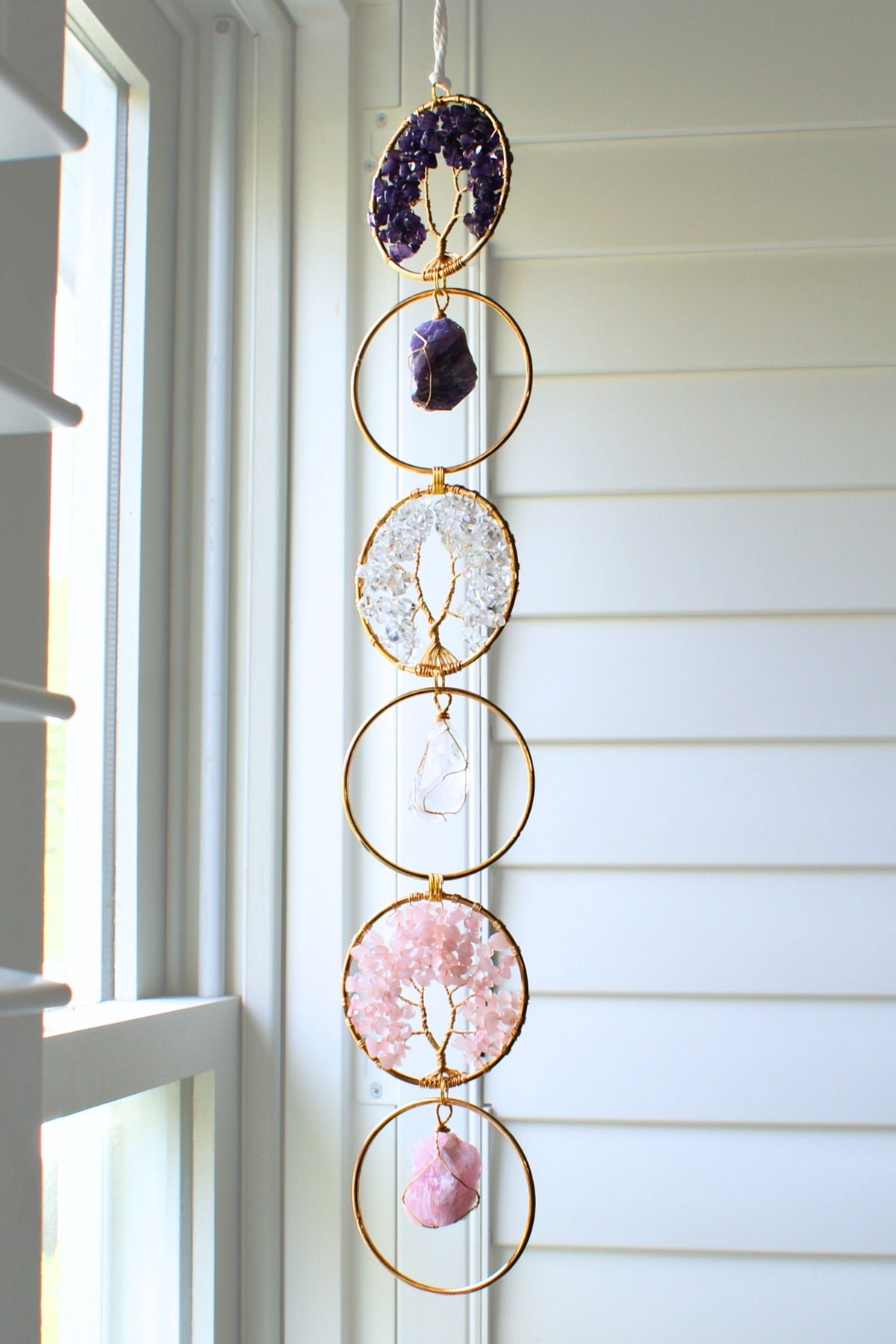 This piece features three hand-crafted crystals - Amethyst, Rose Quartz, and Clear Quartz for clarity. This sizable piece can adorn any indoor or outdoor space, such as a bedframe, window, vanity, or shelves. Experience a heightened sense of well-being and admire the beautiful design.