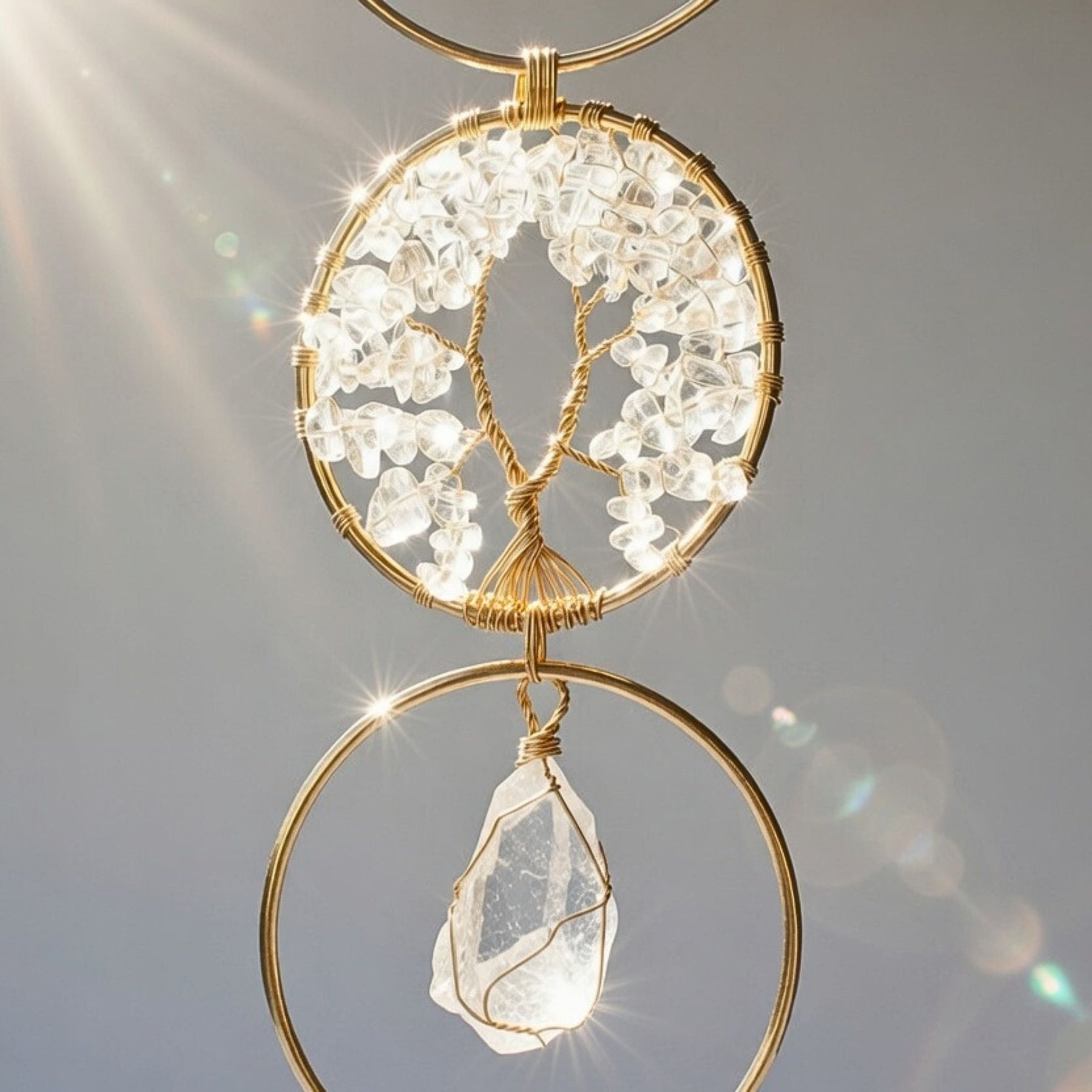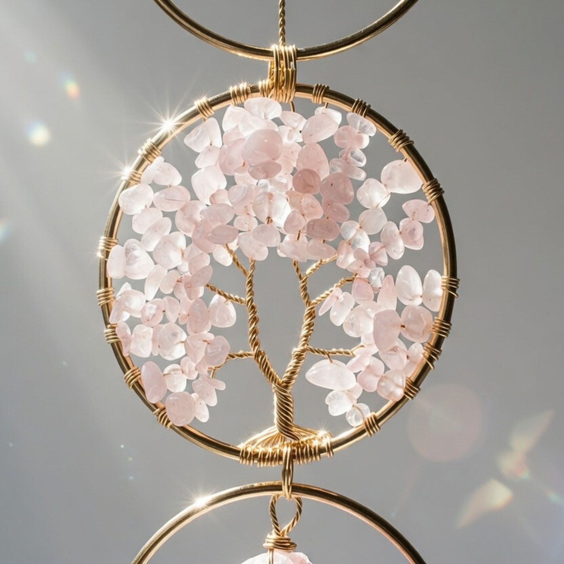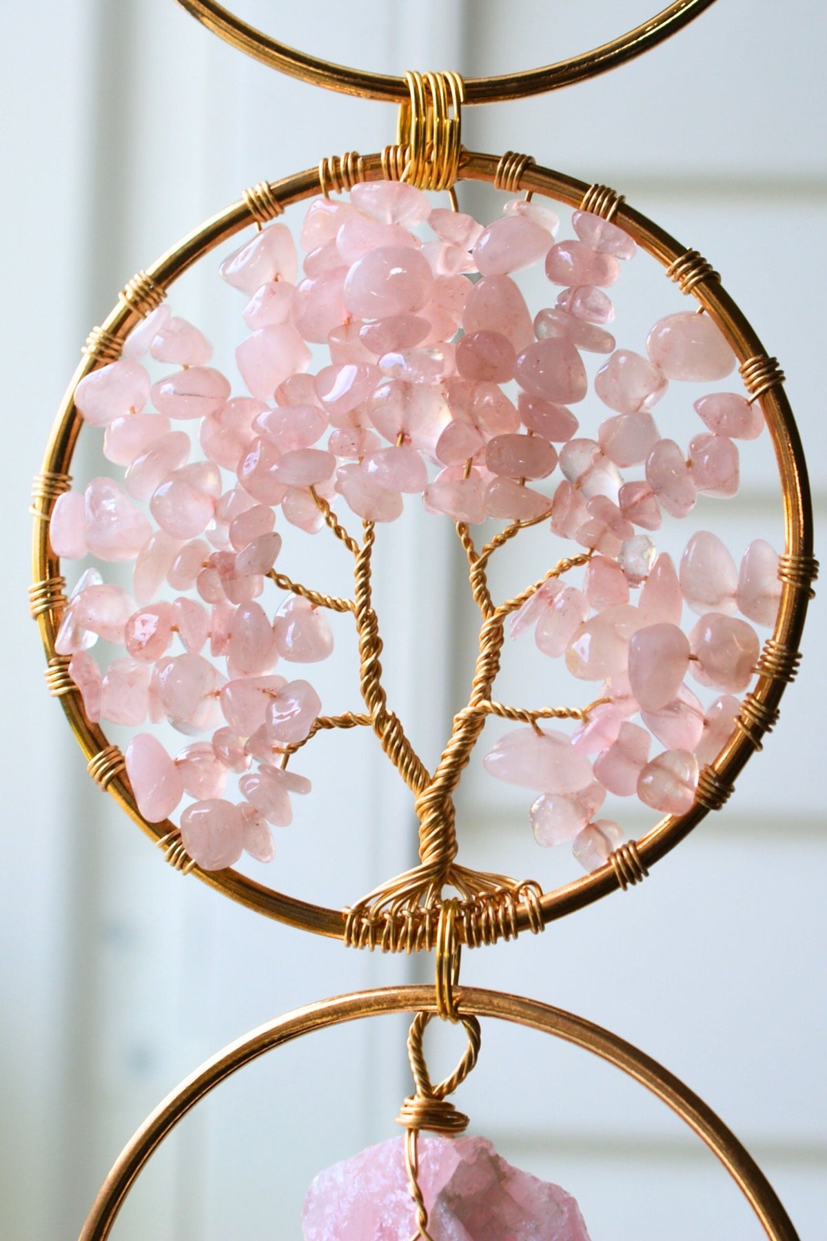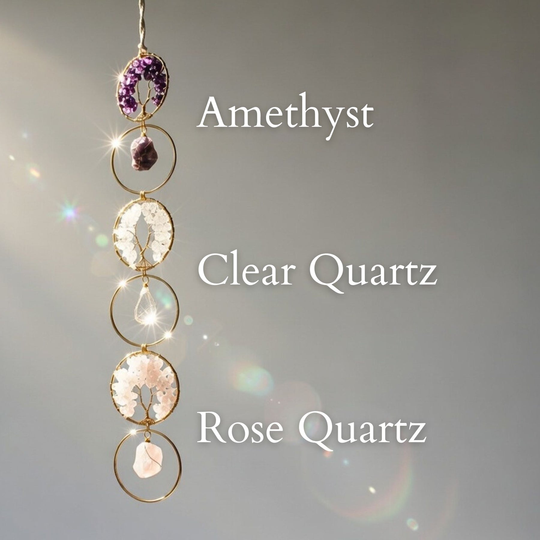 This piece features three hand-crafted crystals - Amethyst, Rose Quartz, and Clear Quartz for clarity. This sizable piece can adorn any indoor or outdoor space, such as a bedframe, window, vanity, or shelves. Experience a heightened sense of well-being and admire the beautiful design.